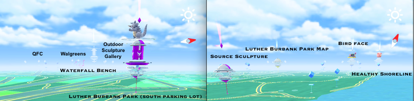 The two Pogovision webcams — live views of the Pokémon virtual world! Covered area: in Mercer Island, Washington. Pogovision lets you see upcoming and current Pokémon raids in 12 gyms, using two different webcams. You can also see team control for the gyms and whether a gym is under attack, as well as the Pokeweather on Mercer Island. Downtown webcam: Luther Burbank webcam: The Luther Burbank cam also lets you see when the PokeStops at Walgreens, QFC, or the Outdoor Sculpture Gallery are lured up. Webcam image frozen or crashed? Try reloading the web page. If reloading the web page doesn't help, then the Pokémon app on the webcam's phone has probably crashed. We'll restart the server as soon as we can. |